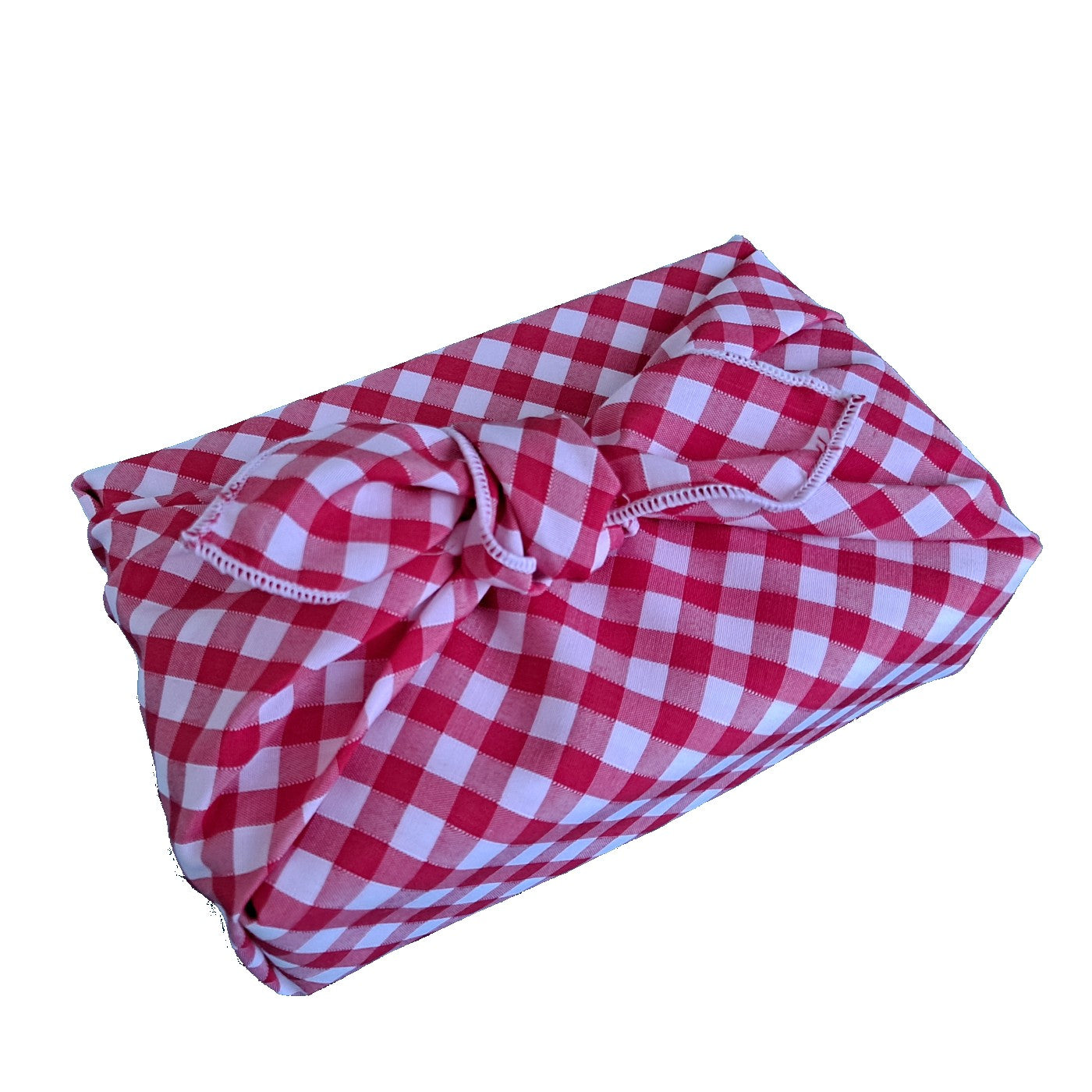 A red gingham furoshiki with a white edging. Perfect for any occasion, dress it with our Christmas adornments for a festive look. A perfect reusable alternative to wrapping paper.